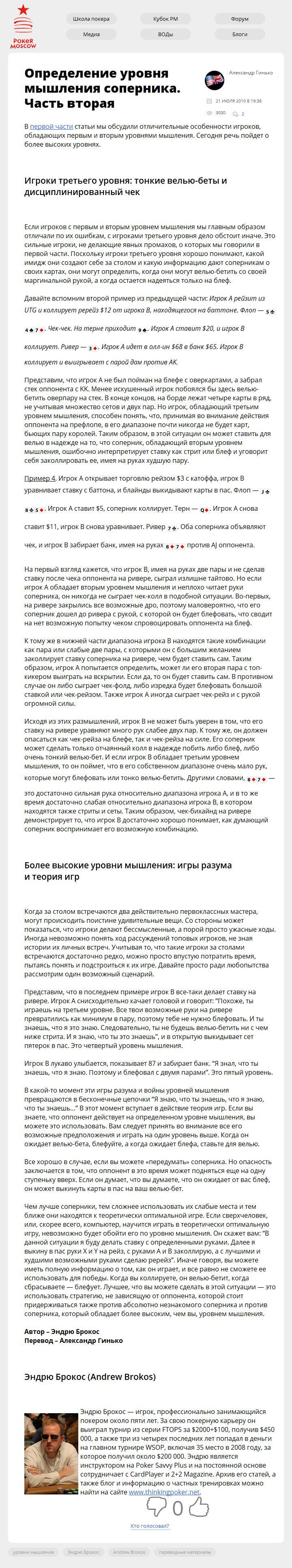 Определение уровня мышления соперника. Часть вторая Опубликовано 21.07.201027.09.2017 Опубликовано по ссылке: В первой части статьи мы обсудили отличительные особенности игроков, обладающих первым и вторым уровнями мышления. Сегодня речь пойдет о более высоких…