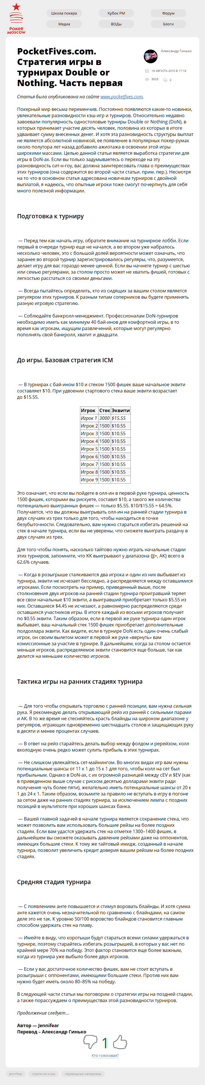 PocketFives.com. Стратегия игры в турнирах Double or Nothing. Часть первая Опубликовано 16.08.201027.09.2017 Опубликовано по ссылке: Статья была опубликована на сайте www.pocketfives.com. Покерный мир весьма переменчив. Постоянно появляются какие-то новинки, увлекательные разновидности кэш-игр и…