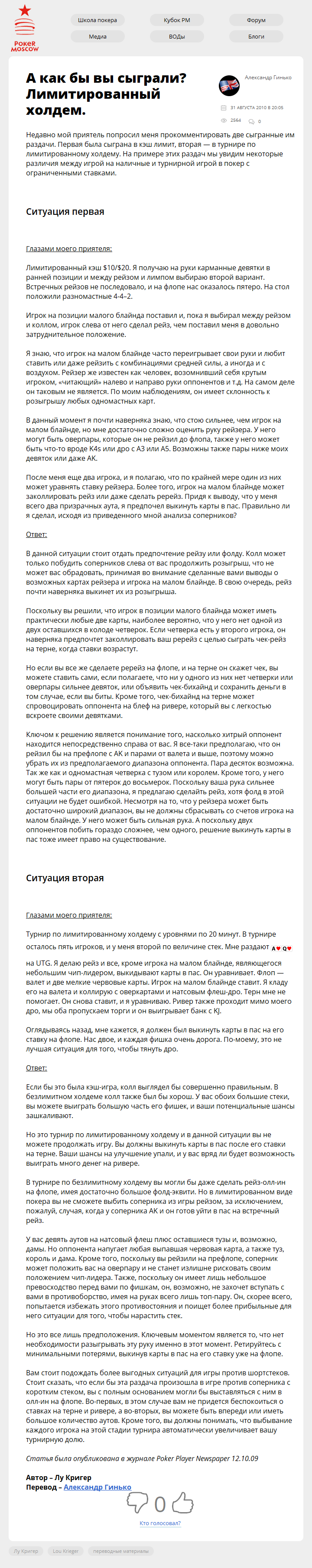 Недавно мой приятель попросил меня прокомментировать две сыгранные им раздачи. Первая была сыграна в кэш лимит, вторая — в турнире по лимитированному холдему. На примере этих раздач мы увидим некоторые различия между игрой на наличные и турнирной игрой в покер с ограниченными…