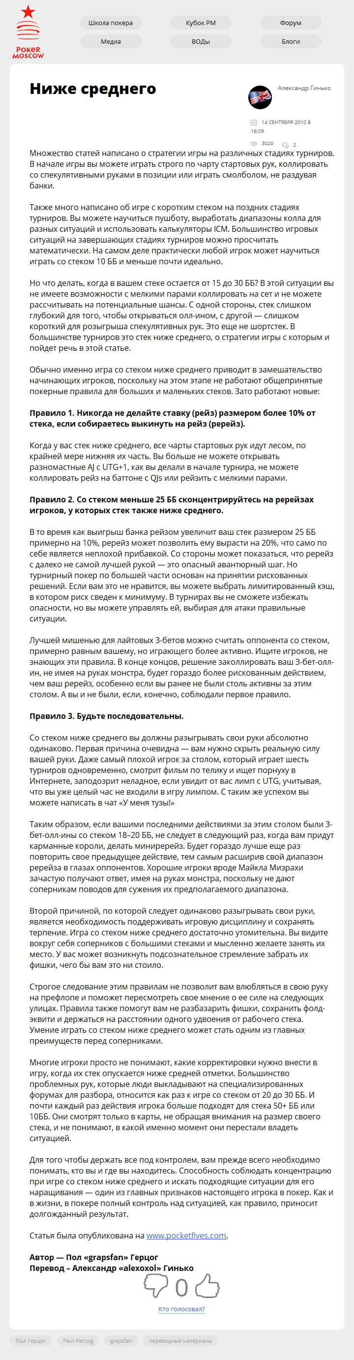 Ниже среднего Опубликовано 14.09.201027.09.2017 Опубликовано по ссылке: Множество статей написано о стратегии игры на различных стадиях турниров. В начале игры вы можете играть строго по чарту стартовых рук, коллировать со спекулятивными руками в позиции или играть смолболом, не раздувая…