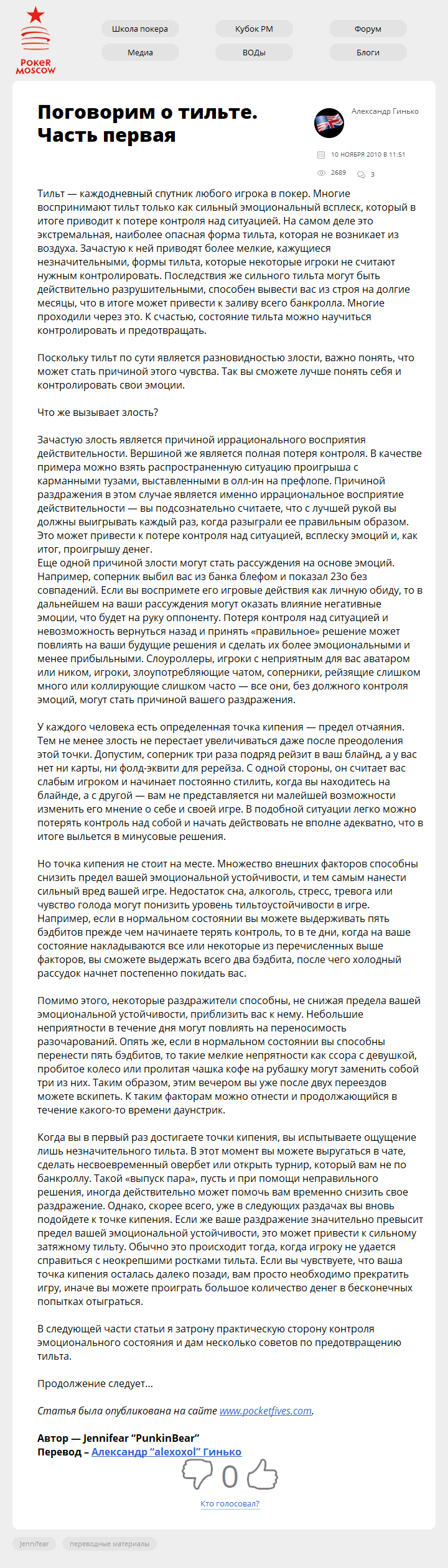 Поговорим о тильте. Часть первая Опубликовано 10.11.201027.09.2017 Опубликовано по ссылке: Тильт — каждодневный спутник любого игрока в покер. Многие воспринимают тильт только как сильный эмоциональный всплеск, который в итоге приводит к потере контроля над…