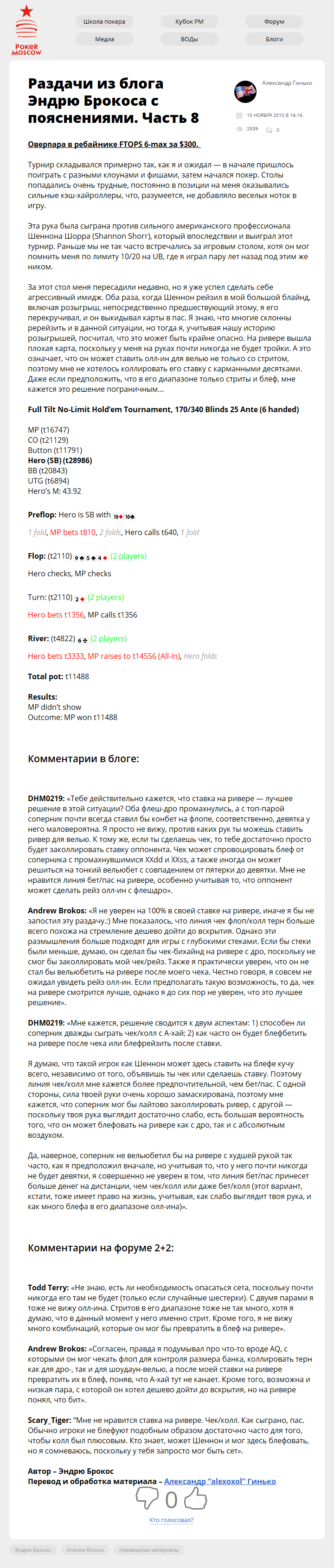Раздачи из блога Эндрю Брокоса с пояснениями. Часть 8 Опубликовано 15.11.201027.09.2017 Опубликовано по ссылке: Оверпара в ребайнике FTOPS 6-max за $300. Турнир складывался примерно так, как я и ожидал — в начале пришлось поиграть с разными клоунами и фишами, затем начался…