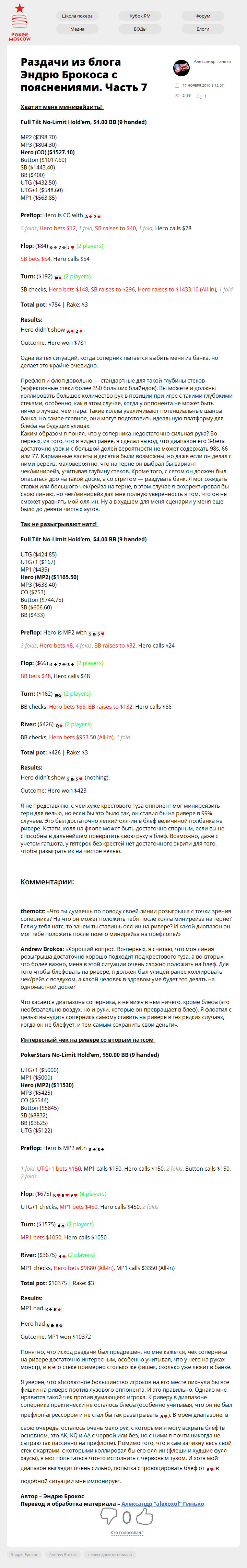 Раздачи из блога Эндрю Брокоса с пояснениями. Часть 7 Опубликовано 17.11.201027.09.2017 Опубликовано по ссылке: Хватит меня минирейзить! Full Tilt No-Limit Hold’em, $4.00 BB (9…