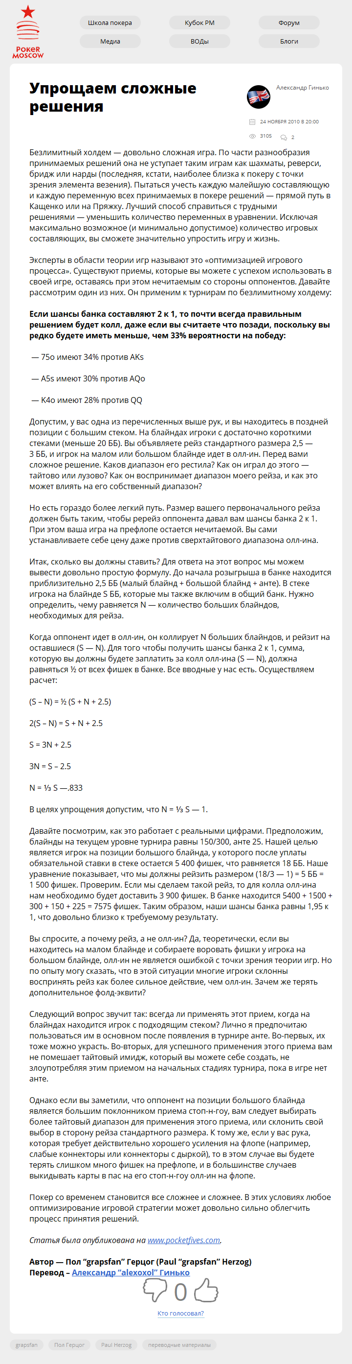 Упрощаем сложные решения Опубликовано 24.11.201027.09.2017 Опубликовано по ссылке: Безлимитный холдем — довольно сложная игра. По части разнообразия принимаемых решений она не уступает таким играм как шахматы, реверси, бридж или нарды (последняя, кстати, наиболее близка к покеру с точки зрения элемента…