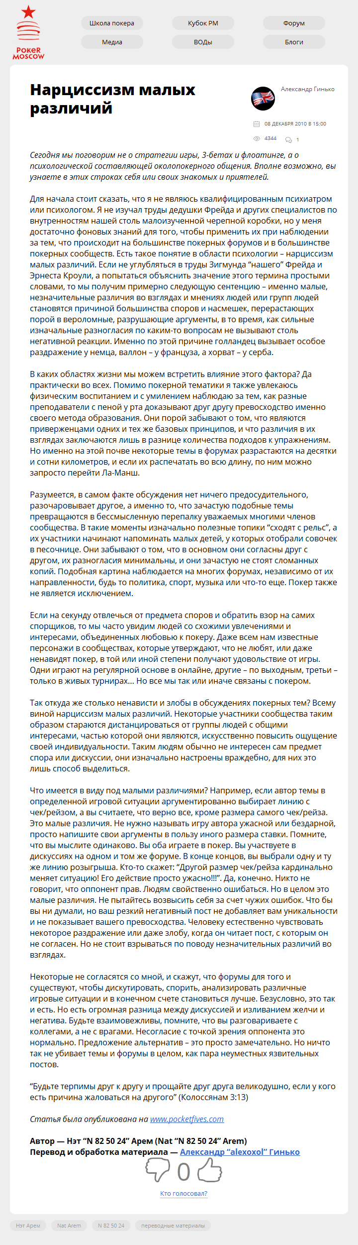 Нарциссизм малых различий Опубликовано 08.12.201027.09.2017 Опубликовано по ссылке: Сегодня мы поговорим не о стратегии игры, 3-бетах и флоатинге, а о психологической составляющей околопокерного общения. Вполне возможно, вы узнаете в этих строках себя или своих знакомых и…