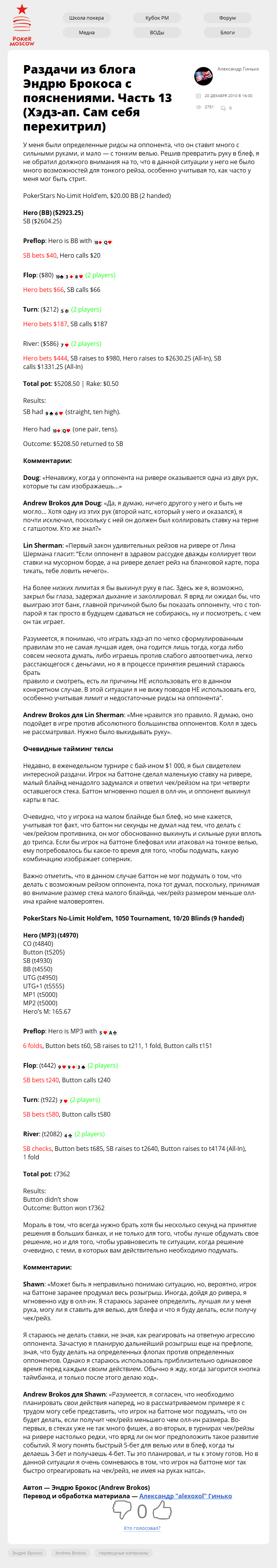 У меня были определенные ридсы на оппонента, что он ставит много с сильными руками, и мало — с тонким велью. Решив превратить руку в блеф, я не обратил должного внимания на то, что в данной ситуации у него не было много возможностей для тонкого рейза, особенно учитывая то, как часто у меня мог быть…