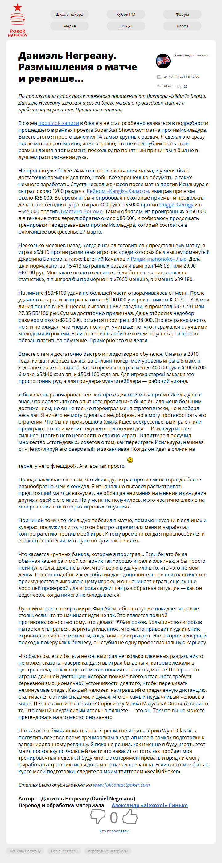 Даниэль Негреану. Размышления о матче и реванше… Опубликовано 24.03.201127.09.2017 Опубликовано по ссылке: По прошествии суток после тяжелого поражения от Виктора "Isildur1" Блома, Даниэль Негреану изложил в своем блоге мысли о прошедшем матче и предстоящем реванше. Приятного…
