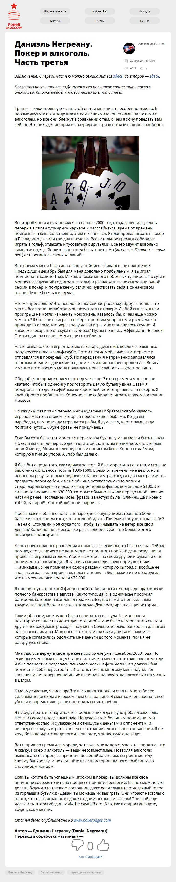 Даниэль Негреану. Покер и алкоголь. Часть третья Опубликовано 25.05.201127.09.2017 Опубликовано по ссылке: Заключение. С первой частью можно ознакомиться здесь, со второй — здесь. Последняя часть трилогии Даниэля о его попытках совместить покер с алкоголем. Кто же выйдет победителем из этой…
