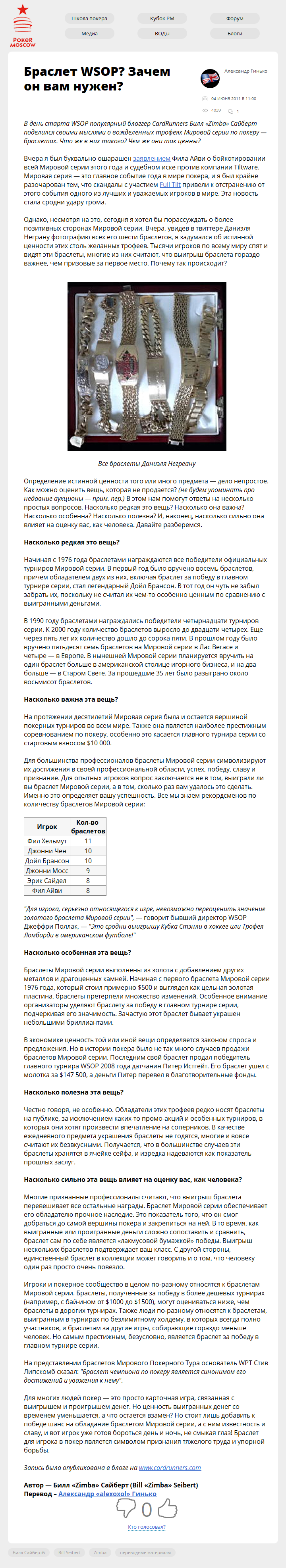 Браслет WSOP? Зачем он вам нужен? Опубликовано 04.06.201127.09.2017 Опубликовано по ссылке: В день старта WSOP популярный блоггер CardRunners Билл "Zimba" Сайберт поделился своими мыслями о вожделенных трофеях Мировой серии по покеру — браслетах. Что же в них такого? Чем же они так…