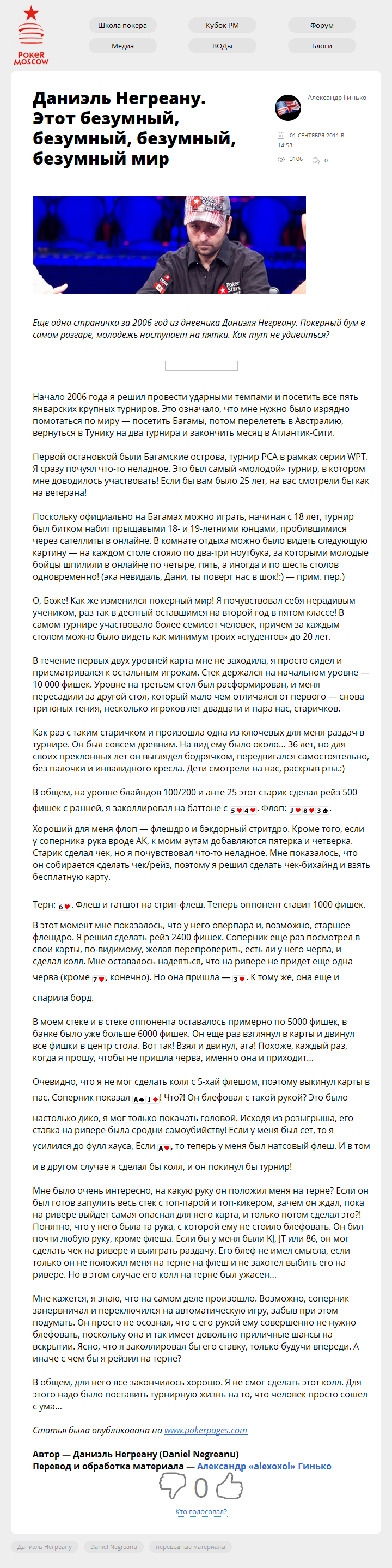 Даниэль Негреану. Этот безумный, безумный, безумный, безумный мир Опубликовано 01.09.201127.09.2017 Опубликовано по ссылке: Еще одна страничка за 2006 год из дневника Даниэля Негреану. Покерный бум в самом разгаре, молодежь наступает на пятки. Как тут не…