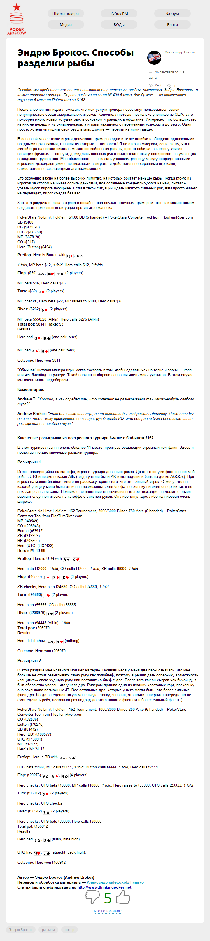 Сегодня мы представляем вашему вниманию еще несколько раздач, сыгранных Эндрю Брокосом, с комментариями автора. Первая раздача из кеша NL400 6-макс, две другие — из воскресного турнира 6-макс на Pokerstars за $162.