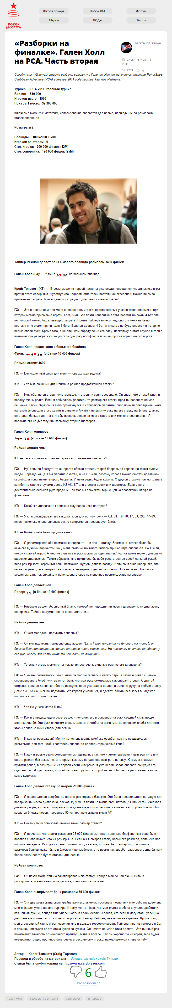 Сегодня мы публикуем вторую раздачу, сыгранную Галеном Холлом на главном турнире PokerStars Caribbean Adventure (PCA) в январе 2011 года против Тайлера Реймана.