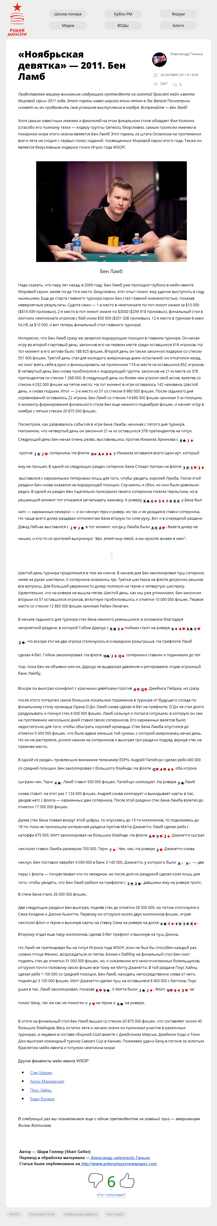 Представляем вашему вниманию следующего претендента на золотой браслет мейн ивента Мировой серии 2011 года. Этот парень навел шороха этим летом в Лас Вегасе! Посмотрим, сможет ли он продолжить свое успешное выступление в ноябре. Встречайте — Бен Ламб!