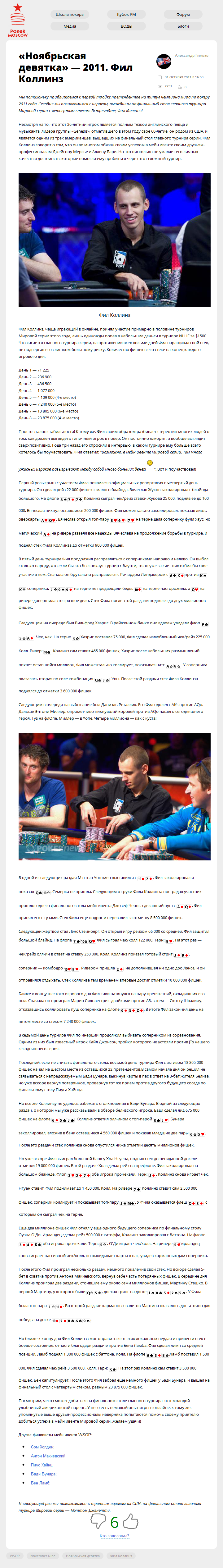 Мы потихоньку приближаемся к первой тройке претендентов на титул чемпиона мира по покеру 2011 года. Сегодня мы познакомимся с игроком, вышедшим на финальный стол главного турнира Мировой серии с четвертым стеком. Встречайте, Фил Коллинз!