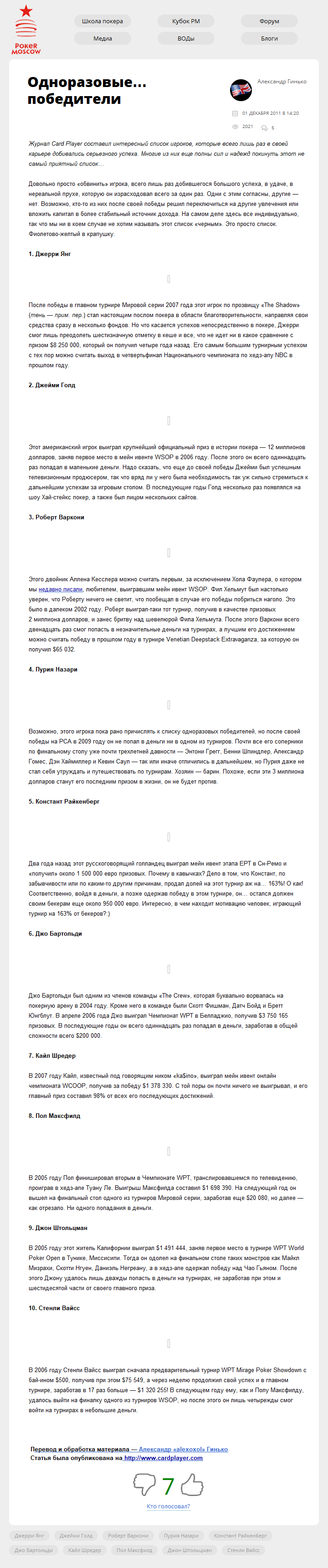 Журнал Card Player составил интересный список игроков, которые всего лишь раз в своей карьере добивались серьезного успеха. Многие из них еще полны сил и надежд покинуть этот не самый приятный список…