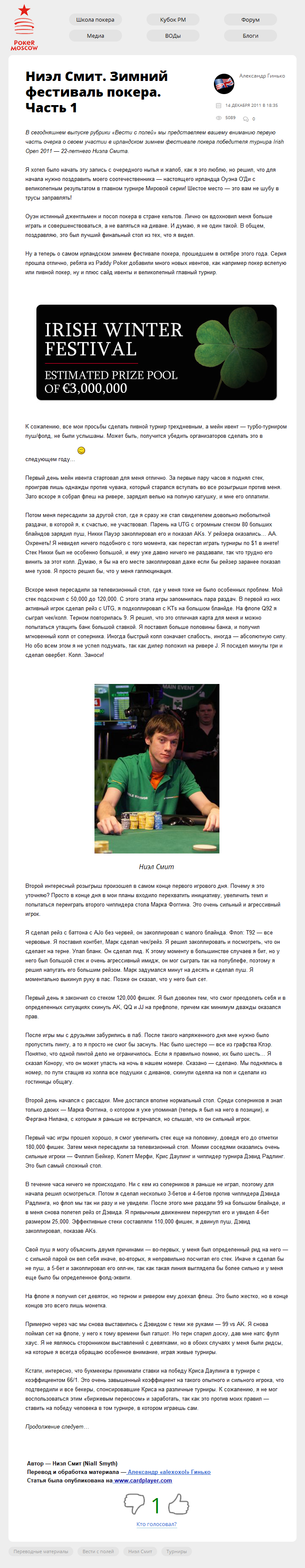 В сегодняшнем выпуске рубрики "Вести с полей" мы представляем вашему вниманию первую часть очерка о своем участии в ирландском зимнем фестивале покера победителя турнира Irish Open 2011 — 22-летнего Ниэла Смита.