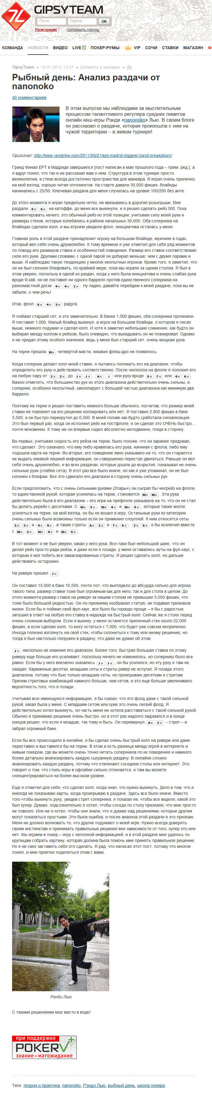 В этом выпуске мы наблюдаем за мыслительным процессом талантливого регуляра средних лимитов онлайн кеш-игры Рэнди «nanonoko» Лью. В своем блоге он рассказал о раздаче, которая произошла с ним на чужой территории – в живом турнире!