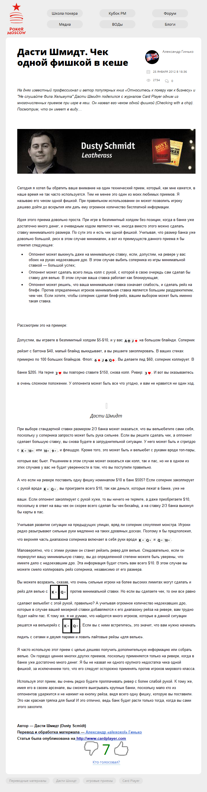 На днях известный профессионал и автор популярных книг "Относитесь к покеру как к бизнесу" и "Не слушайте Фила Хельмута" Дасти Шмидт поделился с журналом Card Player одним из многочисленных приемов при игре в кеш. Он назвал его чеком одной фишкой (Checking with a chip). Посмотрим, что он имеет в…