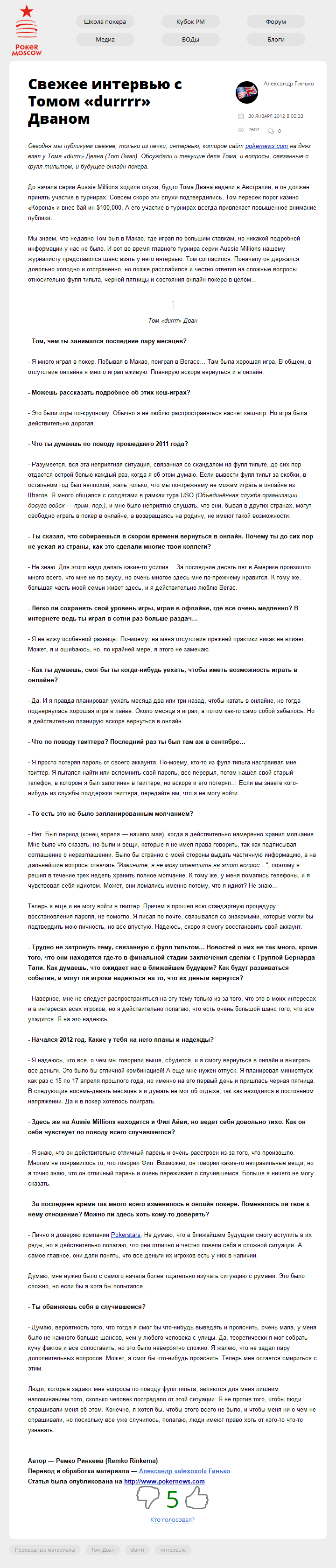 Сегодня мы публикуем свежее, только из печки, интервью, которое сайт pokernews.com на днях взял у Тома "durrrr" Двана (Tom Dwan). Обсуждали и текущие дела Тома, и вопросы, связанные с фулл тильтом, и будущее онлайн-покера.