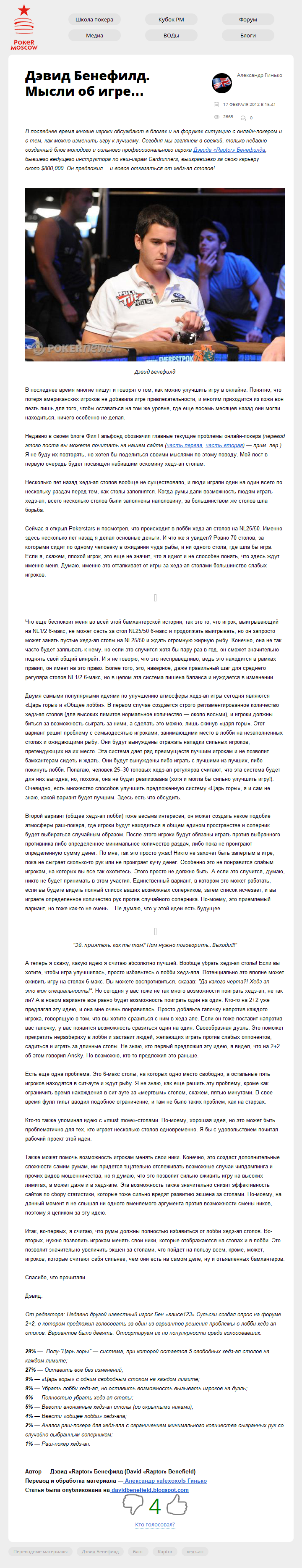 В последнее время многие игроки обсуждают в блогах и на форумах ситуацию с онлайн-покером и с тем, как можно изменить игру к лучшему. Сегодня мы заглянем в свежий, только недавно созданный блог молодого и сильного профессионального игрока Дэвида "Raptor" Бенефилда, бывшего ведущего инструктора по кеш-играм Cardrunners, выигравшего за…