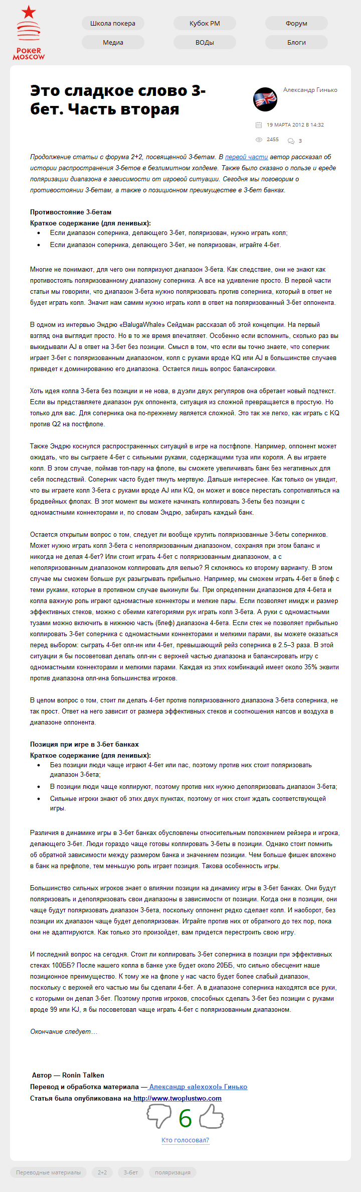 Продолжение статьи с форума 2+2, посвященной 3-бетам. В первой части автор рассказал об истории распространения 3-бетов в безлимитном холдеме. Также было сказано о пользе и вреде поляризации диапазона в зависимости от игровой ситуации. Сегодня мы поговорим о противостоянии 3-бетам, а также о позиционном преимуществе в 3-бет…
