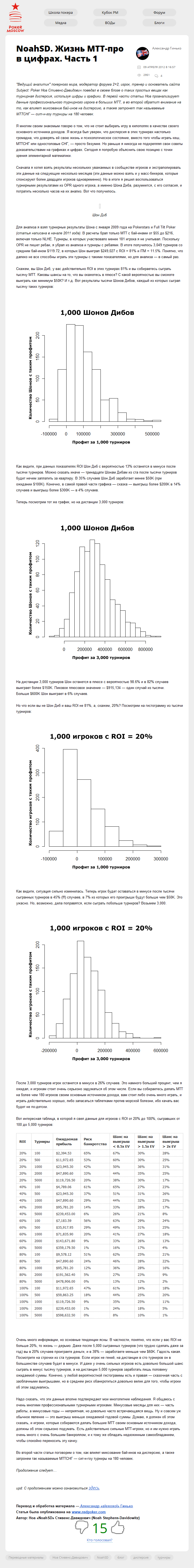 "Ведущий аналитик" покерного мира, модератор форума 2+2, игрок, тренер и основатель сайта Subject: Poker Ноа Стивенс-Давидович поведал в своем блоге о таких простых вещах как турнирная дисперсия, используя цифры и графики. В первой части статьи Ноа проанализирует данные профессионального турнирного игрока в больших МТТ, а во второй…
