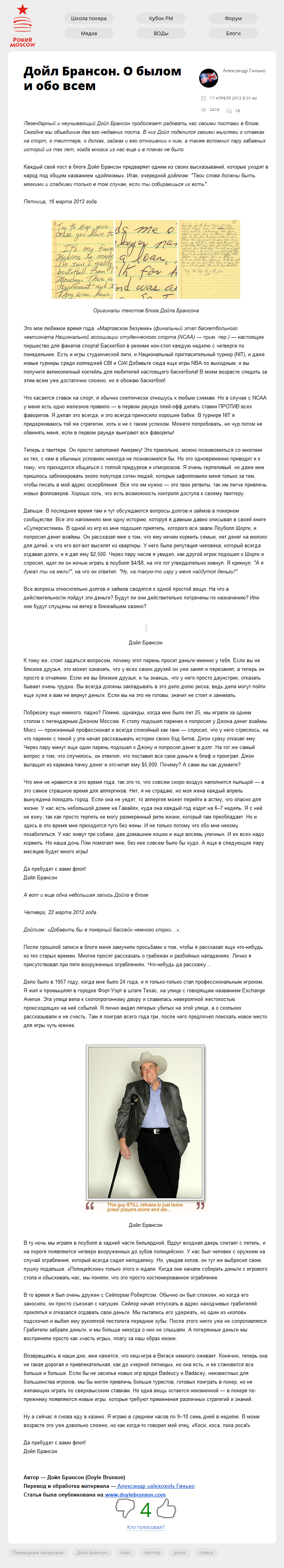 Легендарный и неунывающий Дойл Брансон продолжает радовать нас своими постами в блоге. Сегодня мы объединим два его недавних поста. В них Дойл поделился своими мыслями о ставках на спорт, о твиттере, о долгах, займах и его отношении к ним, а также вспомнил пару забавных историй из тех лет, когда многих из нас еще и в планах не было.