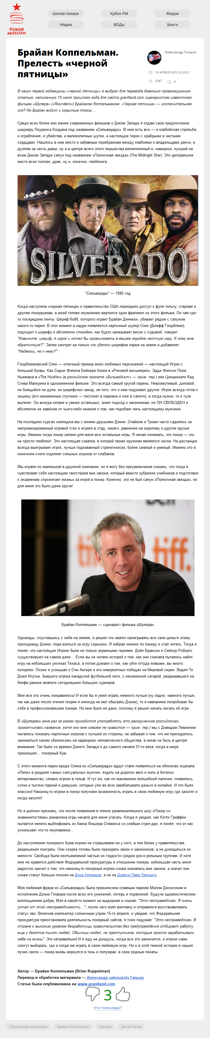 В канун первой годовщины "черной пятницы" я выбрал для перевода довольно провокационную статью, написанную 15 июня прошлого года для сайта grantland.com сценаристом известного фильма "Шулера" ("Rounders") Брайаном Коппельманом. "Черная пятница" — исключительное зло? Но Брайан видит и скрытые…