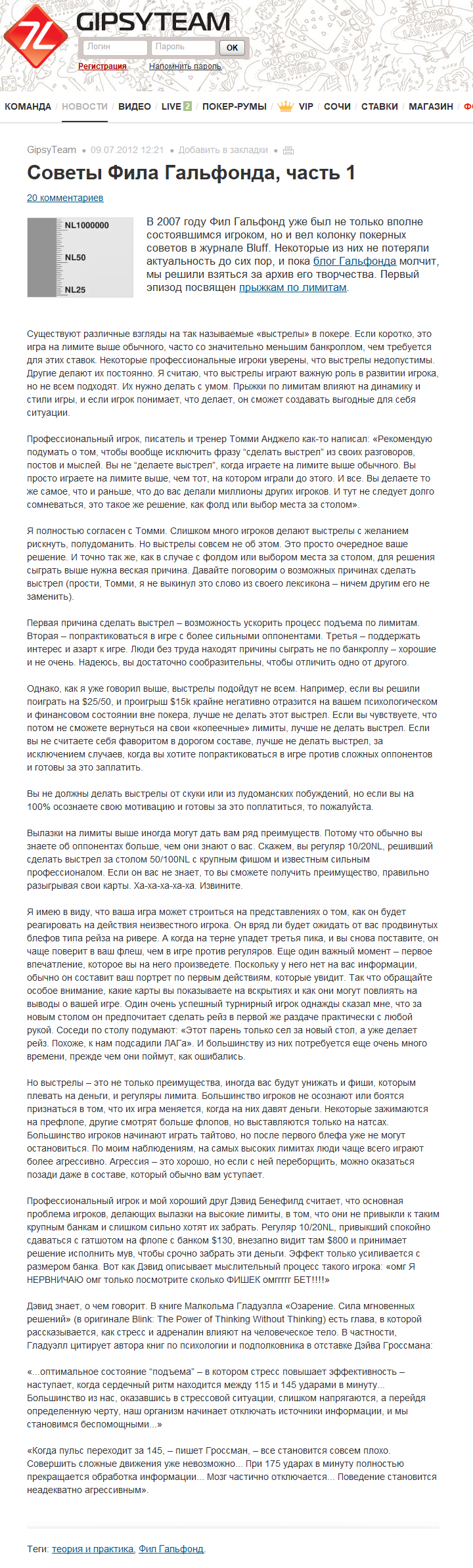 В 2007 году Фил Гальфонд уже был не только вполне состоявшимся игроком, но и вел колонку покерных советов в журнале Bluff. Некоторые из них не потеряли актуальность до сих пор, и пока блог Гальфонда молчит, мы решили взяться за архив его творчества. Первый эпизод посвящен прыжкам по лимитам.