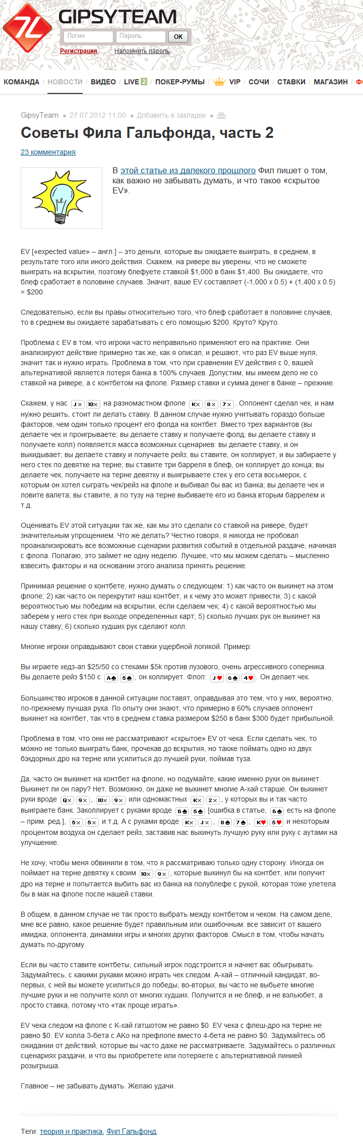 Советы Фила Гальфонда, часть 2 Опубликовано 27.07.201228.09.2017 Опубликовано по ссылке: В этой статье из далекого прошлого Фил пишет о том, как важно не забывать думать, и что такое «скрытое EV».