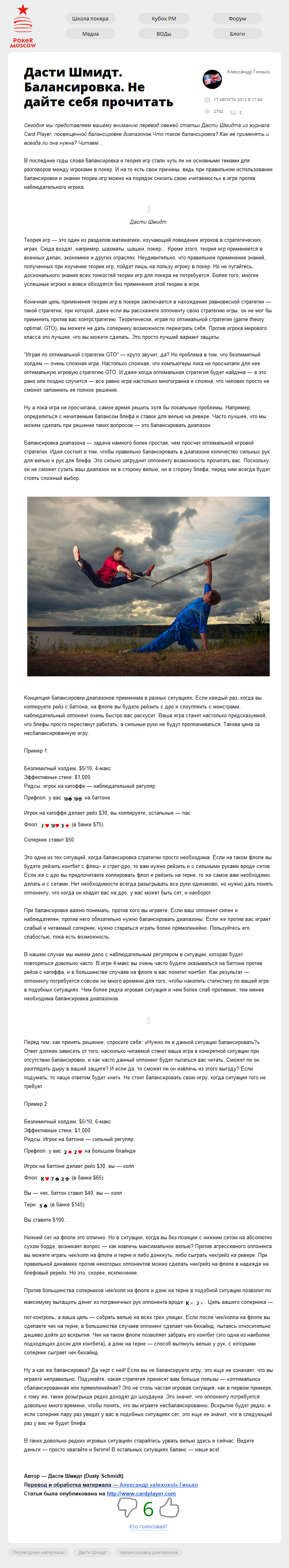 Сегодня мы представляем вашему вниманию перевод свежей статьи Дасти Шмидта из журнала Card Player, посвященной балансировке диапазонов.Что такое балансировка? Как ее применять и всегда ли она нужна? Читаем…