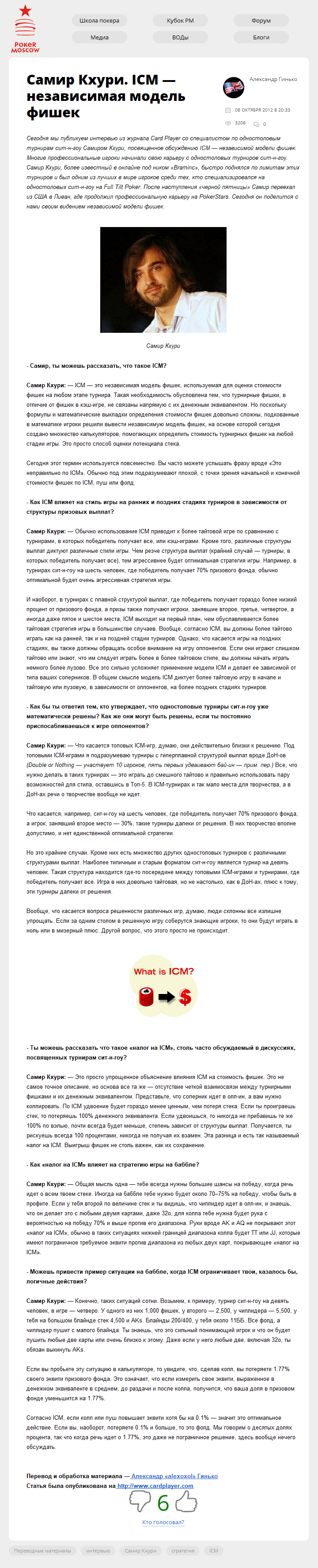 Сегодня мы публикуем интервью из журнала Card Player со специалистом по одностоловым турнирам сит-н-гоу Самиром Кхури, посвященное обсуждению ICM — независимой модели фишек. Многие профессиональные игроки начинали свою карьеру с одностоловых турниров сит-н-гоу. Самир Кхури, более известный в онлайне под ником "Braminc", быстро поднялся…