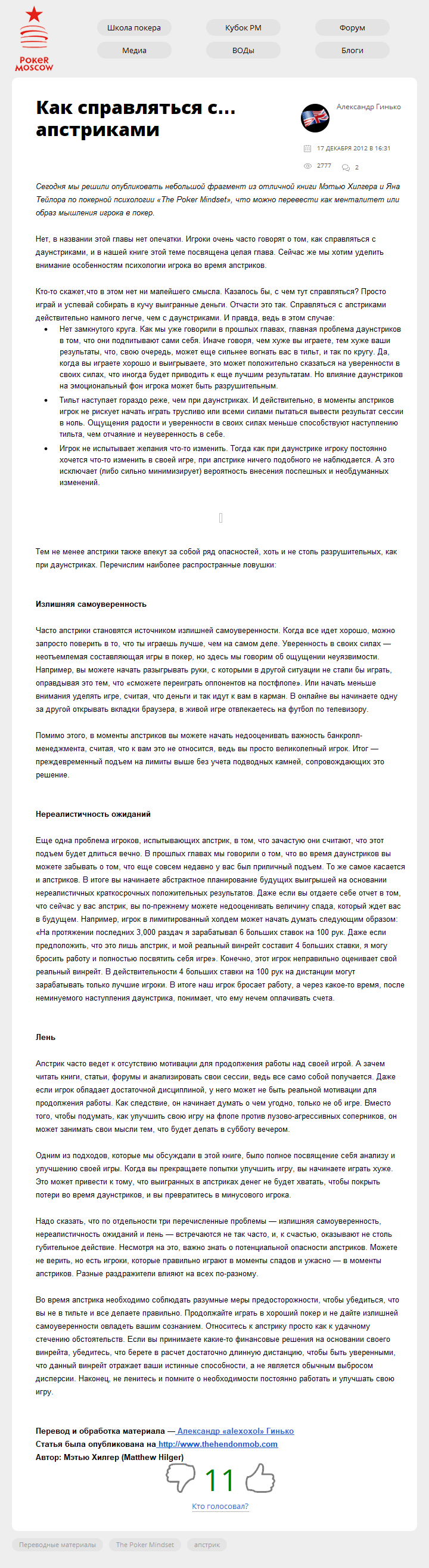 Сегодня мы решили опубликовать небольшой фрагмент из отличной книги Мэтью Хилгера и Яна Тейлора по покерной психологии "The Poker Mindset", что можно перевести как менталитет или образ мышления игрока в покер.