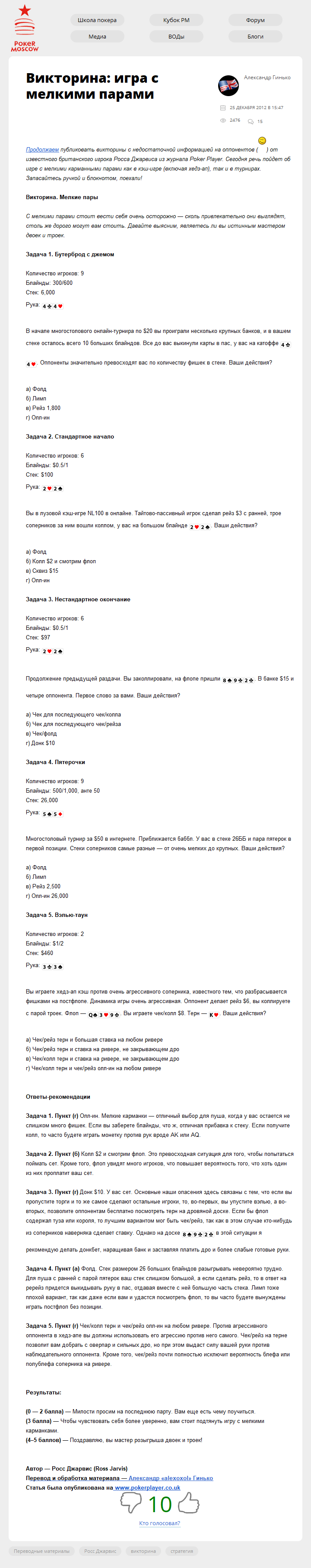 Продолжаем публиковать викторины с недостаточной информацией на оппонентов ( ) от известного британского игрока Росса Джарвиса из журнала Poker Player. Сегодня речь пойдет об игре с мелкими карманными парами как в кэш-игре (включая хедз-ап), так и в турнирах. Запасайтесь ручкой и блокнотом, поехали!