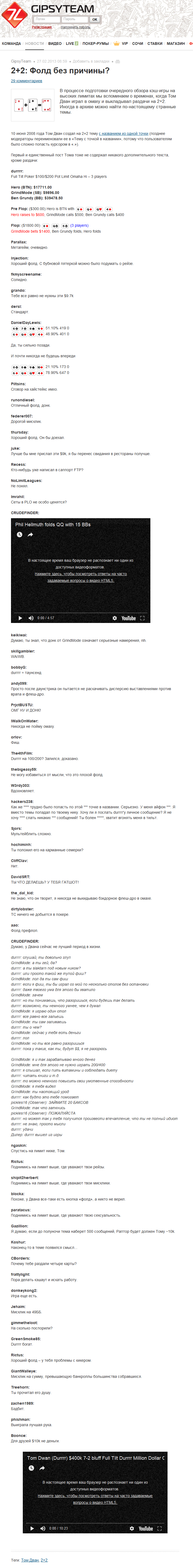 2+2: Фолд без причины? Опубликовано 27.02.201328.09.2017 Опубликовано по ссылке: В процессе подготовки очередного обзора кэш-игры на высоких лимитах мы вспоминаем о временах, когда Том Дван играл в омаху и выкладывал раздачи на 2+2. Иногда в архиве можно найти по-настоящему странные темы.