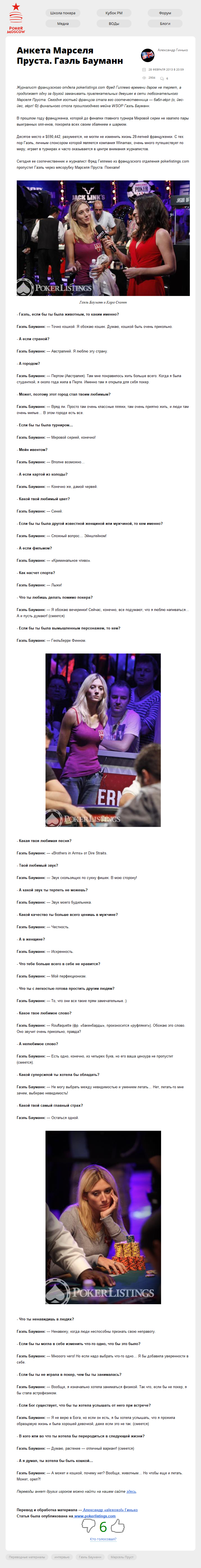 Журналист французского отдела pokerlistings.com Фред Гиллемо времени даром не теряет, а продолжает одну за другой заманивать привлекательных девушек в сети любознательного Марселя Пруста. Сегодня гостьей француза стала его соотечественница — бабл-гёрл (о, йес-йес, гёрл! (с)) финального стола прошлогоднего мейна WSOP Гаэль Бауманн.
