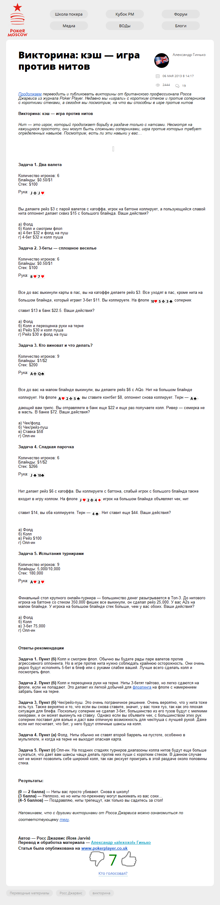 Продолжаем переводить и публиковать викторины от британского профессионала Росса Джарвиса из журнала Poker Player. Недавно мы "играли" с коротким стеком и против соперников с короткими стеками, а сегодня мы посмотрим, на что вы способны в игре против нитов