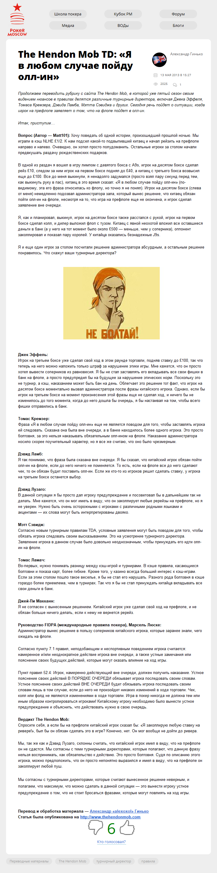 Продолжаем переводить рубрику с сайта The Hendon Mob, в которой уже пятый сезон своим видением нюансов в правилах делятся различные турнирные директора, включая Джека Эффеля, Томаса Кремзера, Дэвида Ламба, Мэтта Сэвиджа и других. Сегодня речь пойдет о ситуации, когда игрок на префлопе заявляет о том, что на флопе пойдет в олл-ин.
