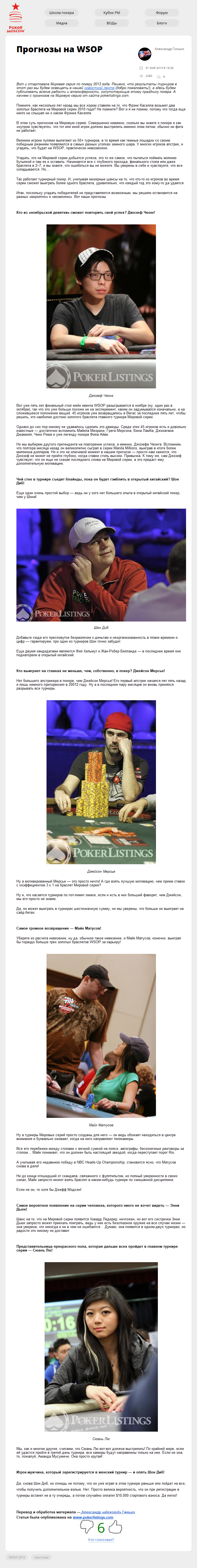Вот и стартовала Мировая серия по покеру 2013 года. Решено, что результаты турниров в этот раз мы будем освещать в нашей новостной ленте (добро пожаловать!), а здесь будем публиковать всякие радости и атмосферности, сопутствующие этому празднику покера. А начнем с прогнозов на Мировую серию от сайта pokerlistings.com.