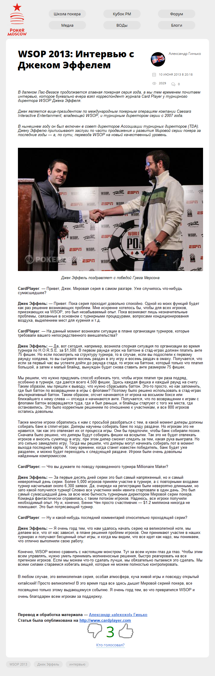 В далеком Лас-Вегасе продолжается главная покерная серия года, а мы тем временем почитаем интервью, которое буквально вчера взял корреспондент журнала Card Player у турнирного директора WSOP Джека Эффеля.