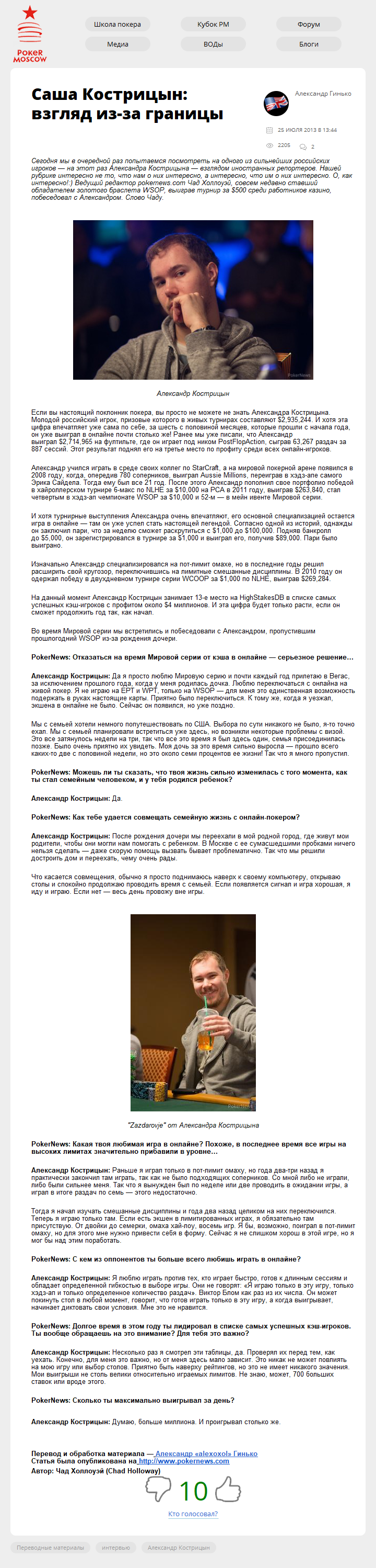 Сегодня мы в очередной раз попытаемся посмотреть на одного из сильнейших российских игроков — на этот раз Александра Кострицына — взглядом иностранных репортеров. Нашей рубрике интересно не то, что нам о них интересно, а интересно, что им о них интересно. О, как интересно! 🙂 Ведущий редактор pokernews.com Чад Холлоуэй, совсем недавно ставший…