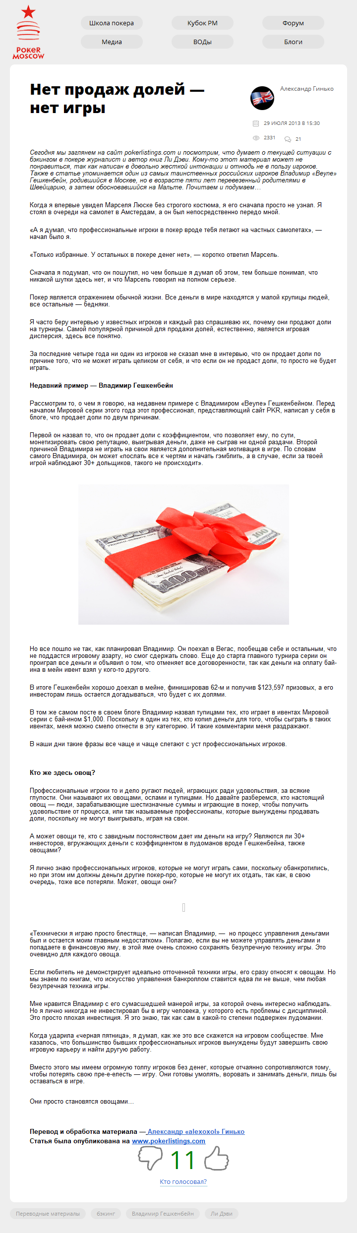 Сегодня мы заглянем на сайт pokerlistings.com и посмотрим, что думает о текущей ситуации с бэкингом в покере журналист и автор книг Ли Дэви. Кому-то этот материал может не понравиться, так как написан в довольно жесткой интонации и отнюдь не в пользу игроков. Также в статье упоминается один из самых таинственных российских игроков Владимир…