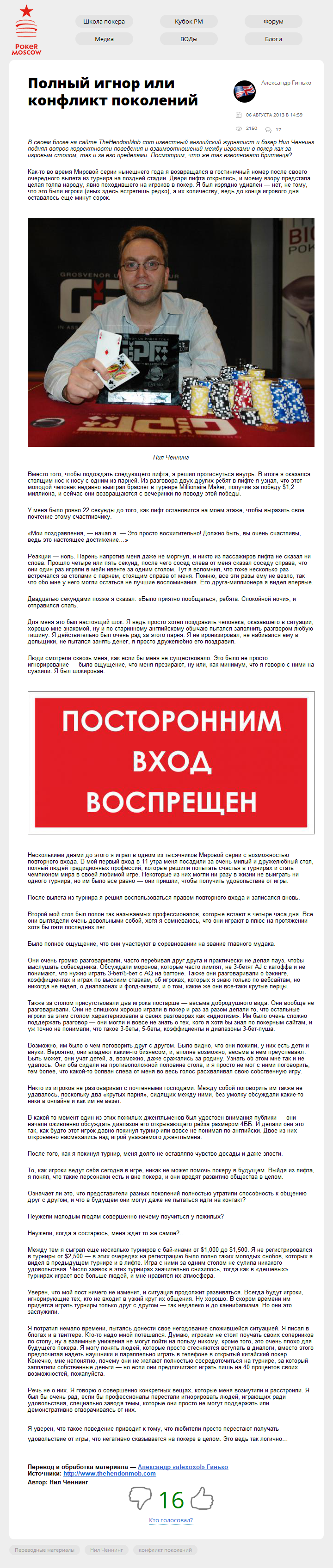 В своем блоге на сайте TheHendonMob.com известный английский журналист и бэкер Нил Ченнинг поднял вопрос корректности поведения и взаимоотношений между игроками в покер как за игровым столом, так и за его пределами. Посмотрим, что же так взволновало британца?