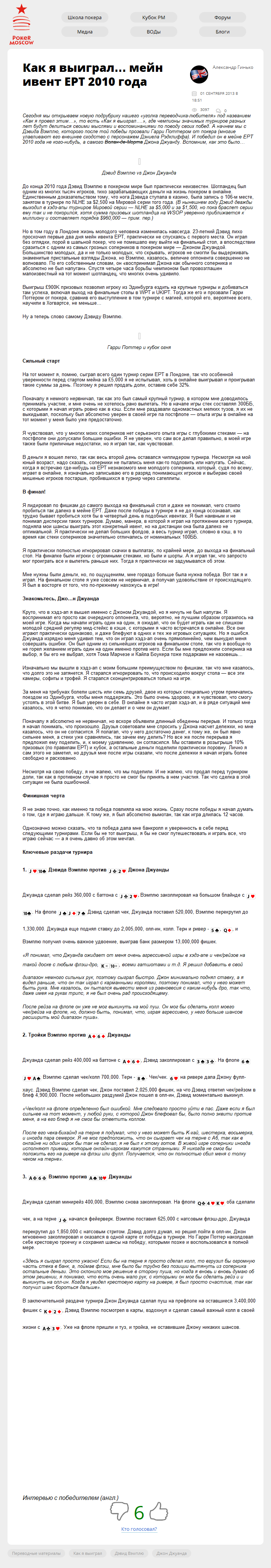 Сегодня мы открываем новую подрубрику нашего "уголка переводчика-любителя" под названием "Как я провел этим…", то есть "Как я выиграл….", где чемпионы значимых турниров разных лет будут делиться своими мыслями и воспоминаниями по поводу своих побед. А начнем мы с Дэвида Вэмплю, которого после той победы прозвали…