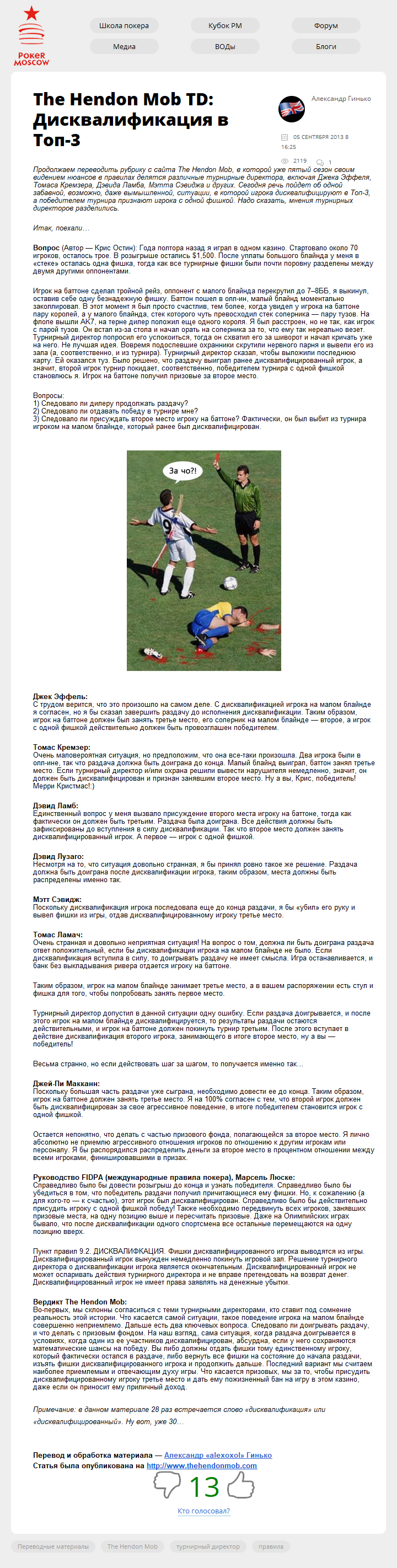 Продолжаем переводить рубрику с сайта The Hendon Mob, в которой уже пятый сезон своим видением нюансов в правилах делятся различные турнирные директора, включая Джека Эффеля, Томаса Кремзера, Дэвида Ламба, Мэтта Сэвиджа и других. Сегодня речь пойдет об одной забавной, возможно, даже вымышленной, ситуации, в которой игрока дисквалифицируют в…