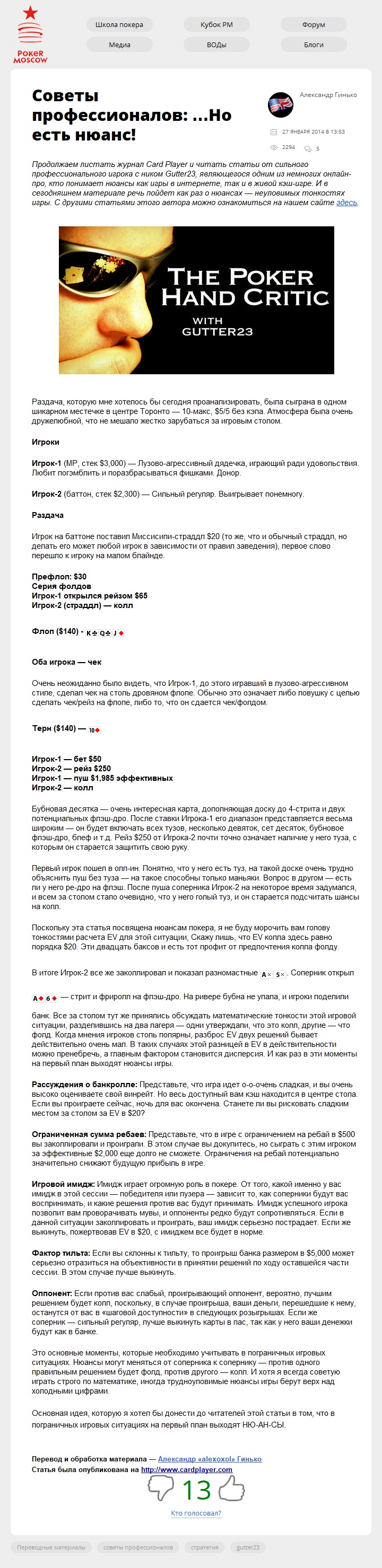 Продолжаем листать журнал Card Player и читать статьи от сильного профессионального игрока с ником Gutter23, являющегося одним из немногих онлайн-про, кто понимает нюансы как игры в интернете, так и в живой кэш-игре. И в сегодняшнем материале речь пойдет как раз о нюансах — неуловимых тонкостях игры. С другими статьями этого автора можно…
