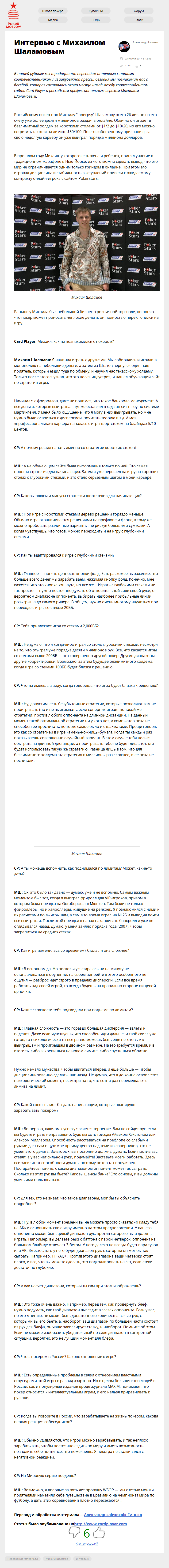 В нашей рубрике мы традиционно переводим интервью с нашими соотечественниками из зарубежной прессы. Сегодня мы познакомим вас с беседой, которая состоялась около месяца назад между корреспондентом сайта Card Player и российским профессиональным игроком Михаилом Шаламовым.