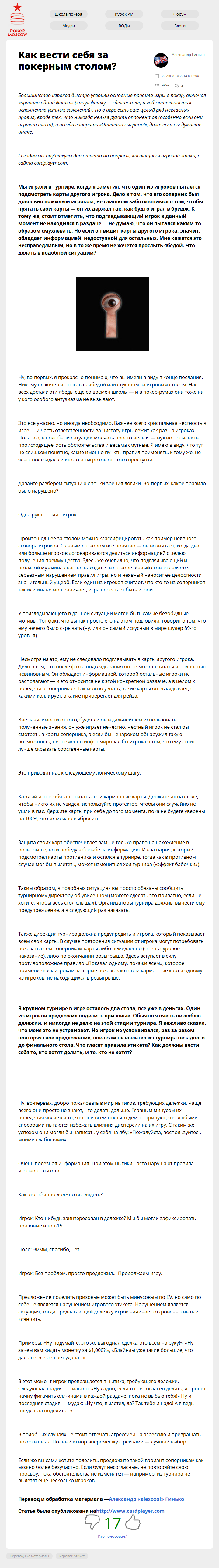 Большинство игроков быстро усвоили основные правила игры в покер, включая «правило одной фишки» (кинул фишку — сделал колл) и «обязательность к исполнению устных заявлений». Но в игре есть еще целый ряд негласных правил, вроде тех, что никогда нельзя ругать оппонентов (особенно если они играют плохо), и всегда говорить «Отлично сыграно!», даже…