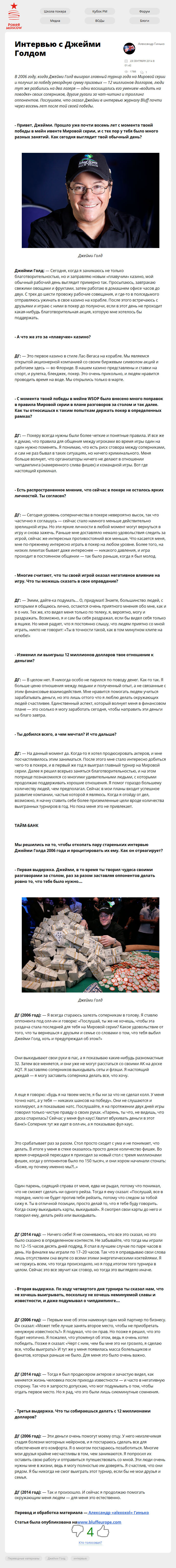 В 2006 году, когда Джейми Голд выиграл главный турнир года на Мировой серии и получил за победу рекордную сумму призовых — 12 миллионов долларов, люди тут же разбились на два лагеря — одни восхищались его умением «водить на поводке» своих соперников, другие ругали за чат-читинг и троллинг оппонентов. Послушаем, что сказал Джейми в интервью журналу…