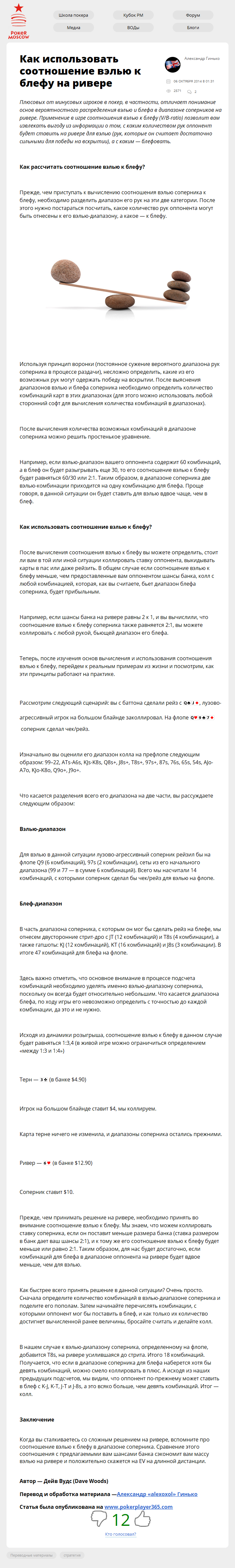 Плюсовых от минусовых игроков в покер, в частности, отличает понимание основ вероятностного распределения вэлью и блефа в диапазоне соперников на ривере. Применение в игре соотношения вэлью к блефу (V/B-ratio) позволит вам извлекать выгоду из информации о том, с каким количеством рук оппонент будет ставить на ривере для вэлью (рук, которые он…
